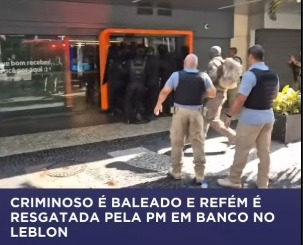 Também em nota, a assessoria de imprensa da PM comunicou que "um homem tomou uma mulher como refém em uma agência bancária na Av. Ataulfo de Paiva, no Leblon. Equipes do Batalhão de Operações Policiais Especiais (Bope) foram acionadas e o acusado foi atingido, sendo socorrido pelo Grupamento Especial de Salvamento e Ações de Resgate (GESAR) ao Hospital Municipal Miguel Couto, na Gávea. A área foi isolada e a 14ª DP conduz as investigações".